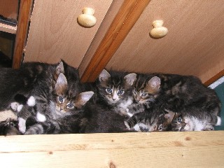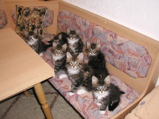 Der Wurf ist geboren am: 02.07.2008 Die Namen sind: Cleopatra, Celina, Chiara, Cindarella, Clarence, Clyde und Collin brown classic tabby white